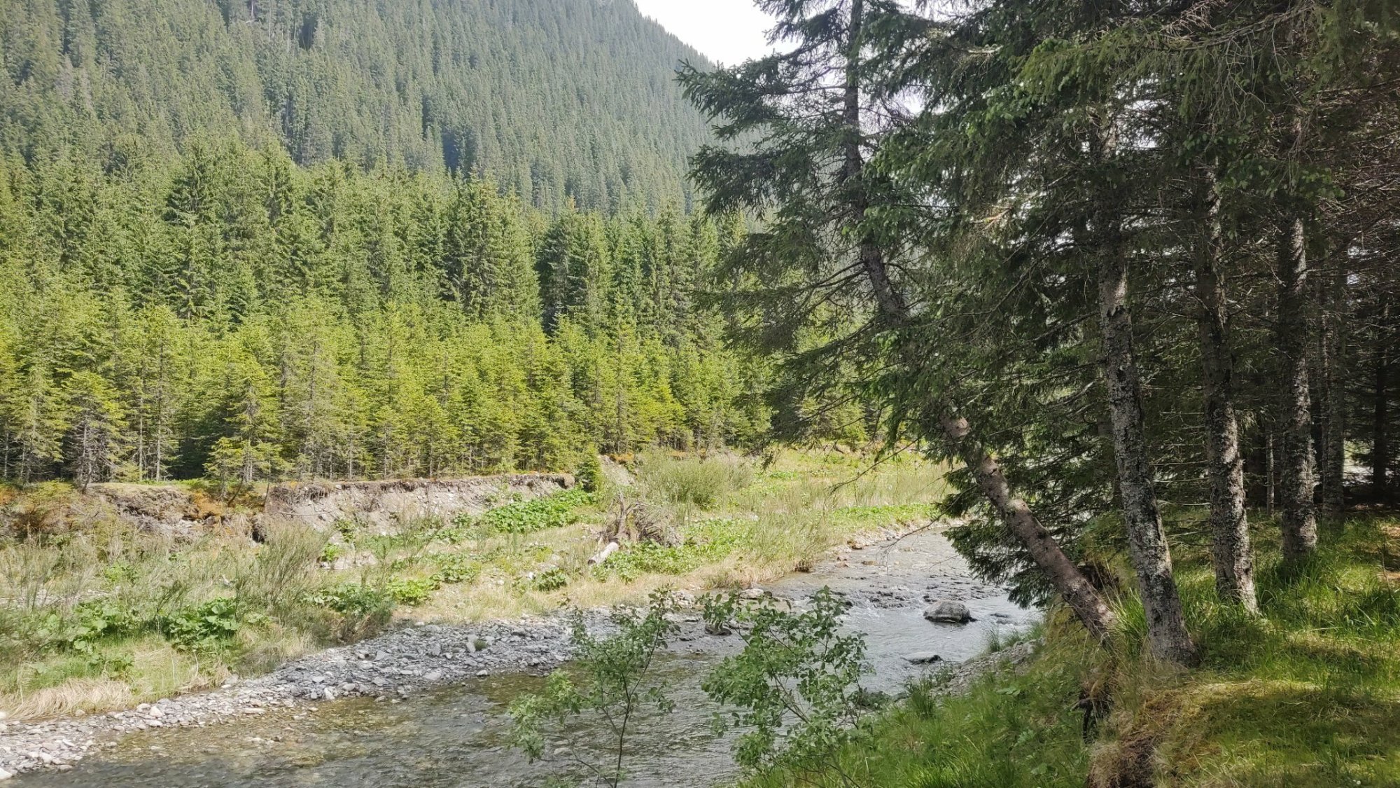 Stiže nas polako umor, pogotovo Srki nije spavao mnogo noć pre puta. Taman kad nas popušta želja da jurcamo otvara se ravan put, šuma i rečica. Stajemo i prostiremo jakne na travi pored reke. Dok Srki odmara ja slikam mašine i nestvarno lepu prirodu koja se otvorila tik ispred nas. Škljocam malo jače fotoaparatom, da poteram medvede kojih ovde verovatno ima. Delovalo je, nije nam nijedan prišao.