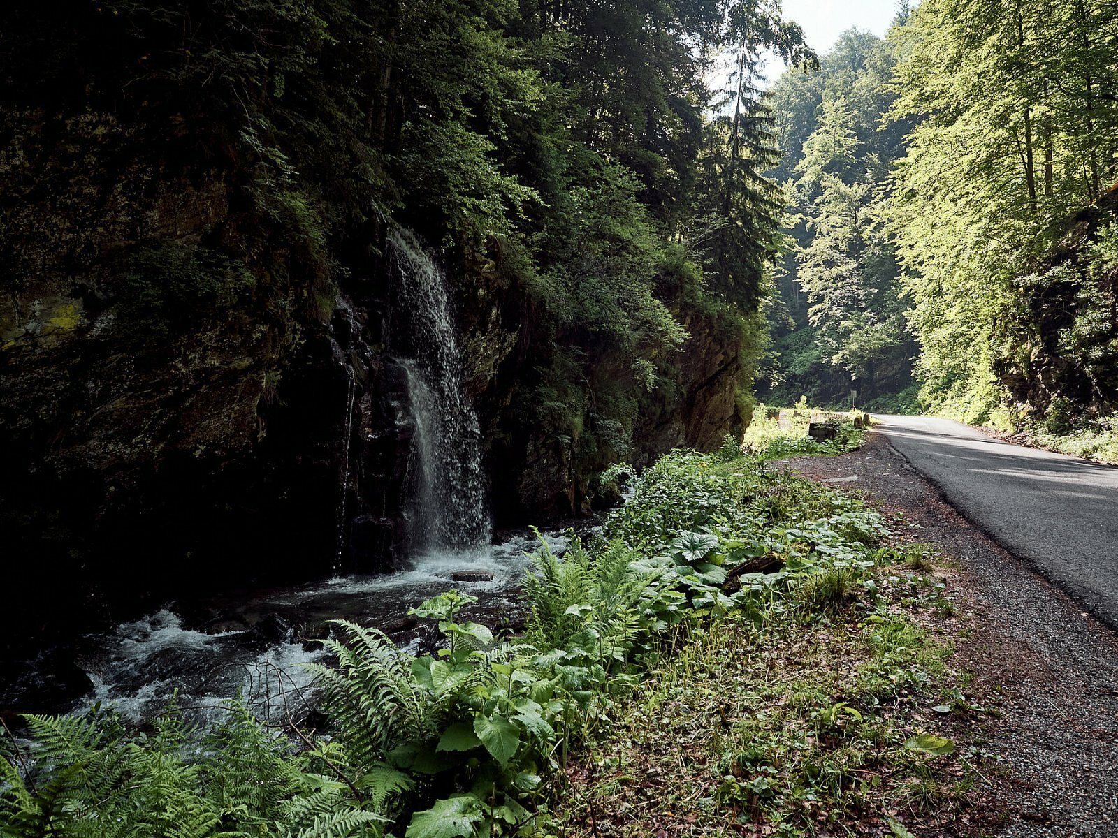 Napuštamo naselja i gužvu radnog dana i počinjemo da uživamo u suncu dok se polako penjemo na oko 1700m. Svež vazduh, sunce i osmeh na licu – buđenje za preporuku. Usput pretičemo Špance koji prate isti put, ali zaobilaze offroad deo i asfaltom idu do Băile Herculane. Rešavamo drugu kafu dana u Obârşia Lotrului i nastavljamo putem 7A ka Petroșani. Put nije toliko dobar kao 67C, delimično je i uži ali nije opterećen. Krivudamo po šumi i otvorenim proplancima, pratimo malu rečicu koja se vijuga tik uz put. Stajemo kod nekog malog vodopada koji se samo stvorio iza krivine.