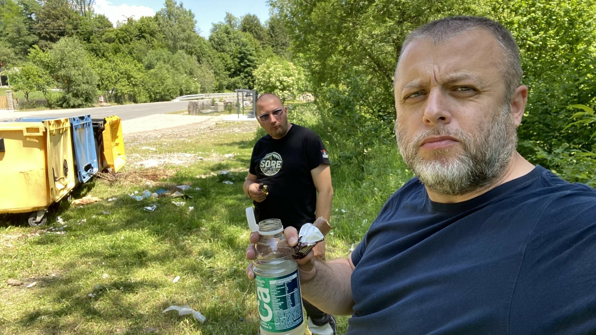 Ulazimo u Petroșani, sipamo gorivo i polako počinjemo da tražimo neku pekaru. Prolazimo Petroșani i dva, tri sela i već vidimo da ćemo offroad deo voziti za kritično praznim stomacima. Prva picerija usput je izabrana na mapi. Crash-ujemo neki dečiji rođendan i provodimo dobrih dva, tri sata u poručivanju i čekanju klope. Već uveliko kriziramo i bodemo očima konobara i konobaricu koji nas vešto izbegavaju. Ja varim na prazno, da čuju. Vidimo da nema od toga ničega, naći će se valjda pekara neka u prokletom Uricani. Namrgođeni izlazimo da im pokažemo da smo razočarani. Upadamo najzad u neku pekaru kao iz vremena Sovjeta – ima samo hleba i nekih slatkiša. Prodavačica nam pokazuje neku burger radnju koja je u 12, 13h krcata tako da i to otpada; upadamo u neku prodavnicu. Duga priča, kratka reč – hranimo se nekim sumnjivim pica hlebom iz folije – nit je pica nit je hleb, Twixovima i Snickersima uz neku vitamin vodu pored neke kante na magistrali, pošto je i sunce već zažeglo i ovo je bila prva senka. Selfi kao dokaz i teramo.